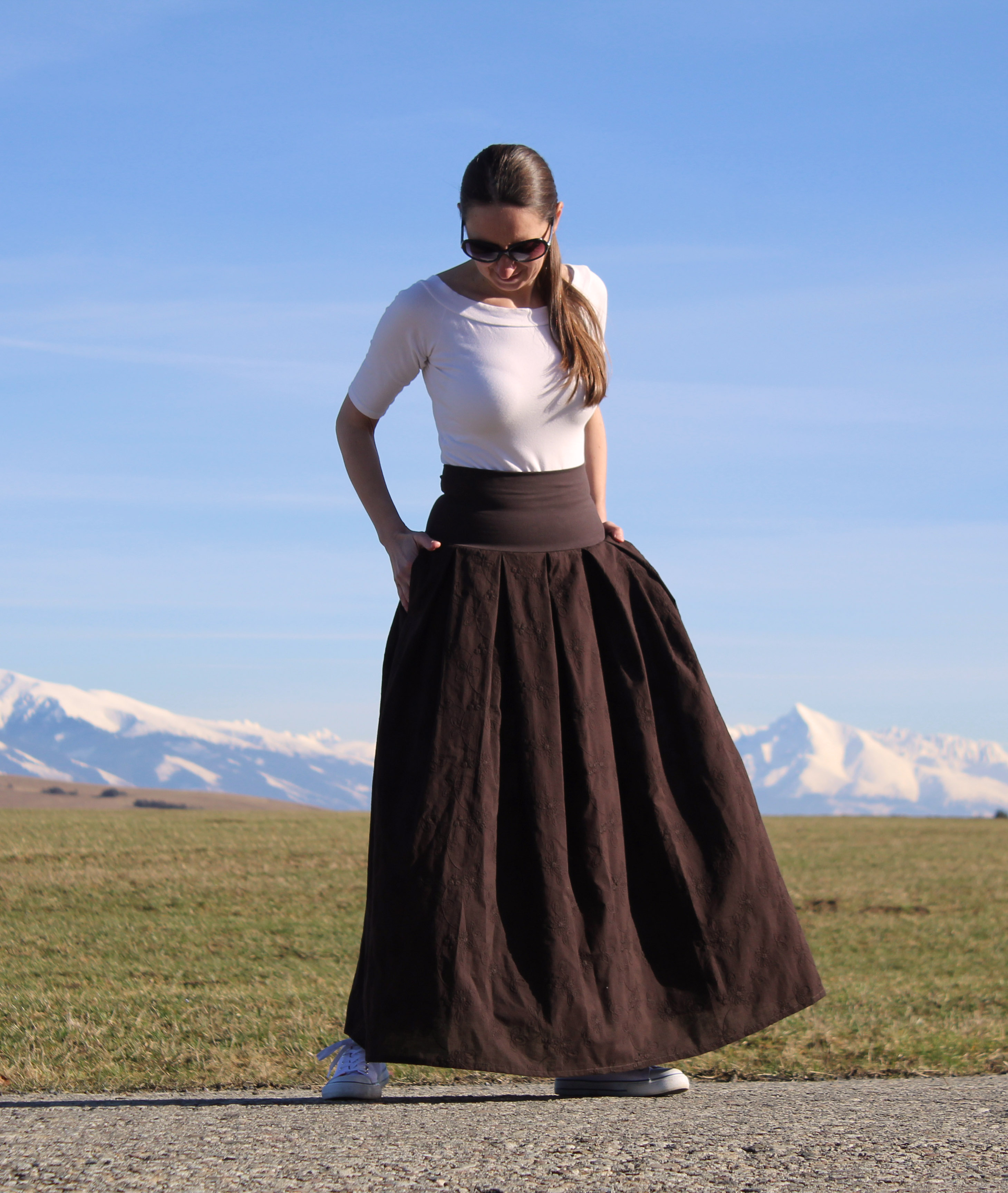Sukňa je ušitá zo vzdušnej letnej bavlny s vyšívanými kvetmi. Je skladaná, v hornej časti je bavlnený pružný pás, takže sa pekne prispôsobí postave. V bočných švíkoch sú skryté vrecká.