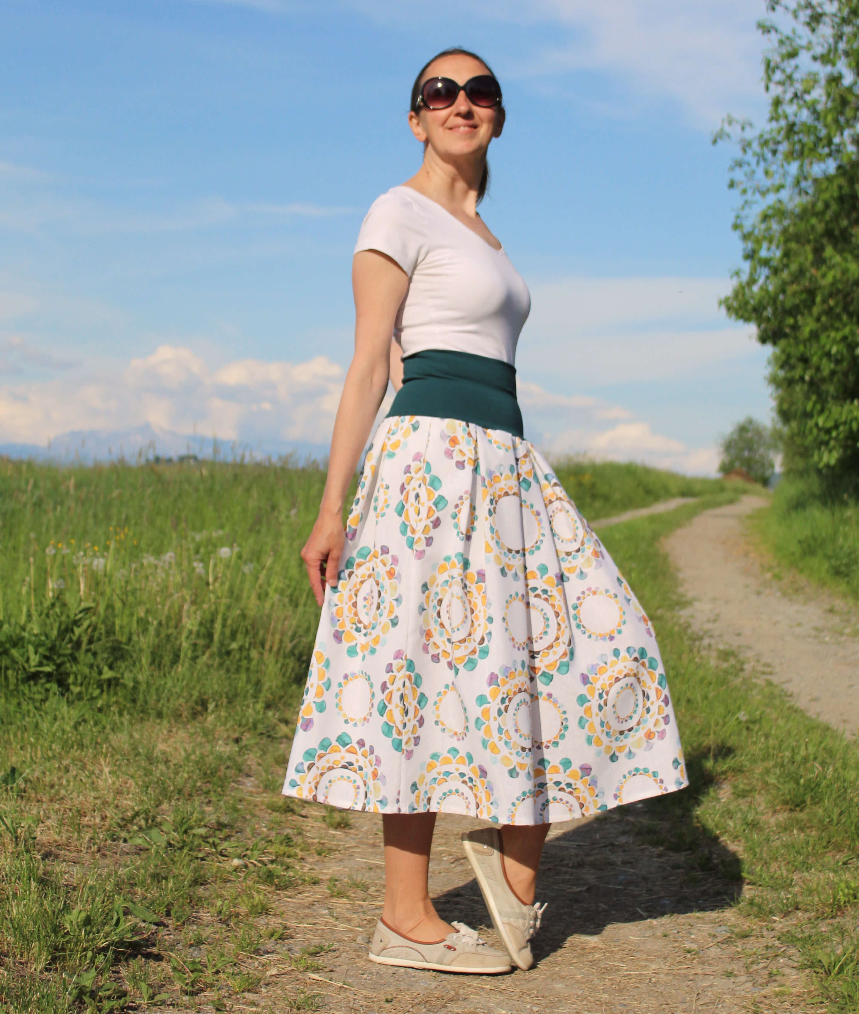 Sukňa je ušitá z pevnejšej dizajnovej zmesovejbavlny bielej farby so vzorom farebných mandál. V bočných švíkoch sú vsadené vrecká. V hornej časti je pružný úpletový pás, takže sa pekne prispôsobí postave.