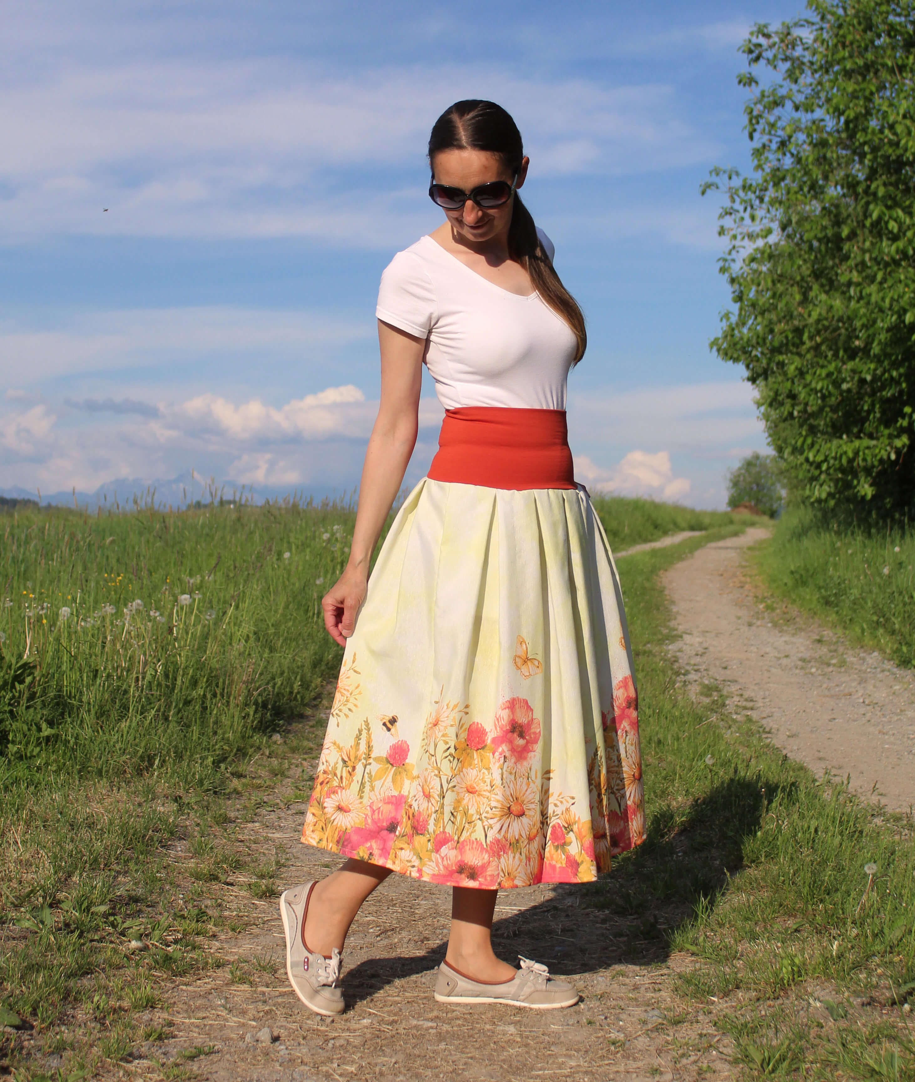 Sukňa je ušitá z pevnejšej dizajnovej zmesovej bavlny žltej farby s bordúrovým vzorom kvetín. V bočných švíkoch sú vsadené vrecká. V hornej časti je pružný úpletový pás, takže sa pekne prispôsobí postave.