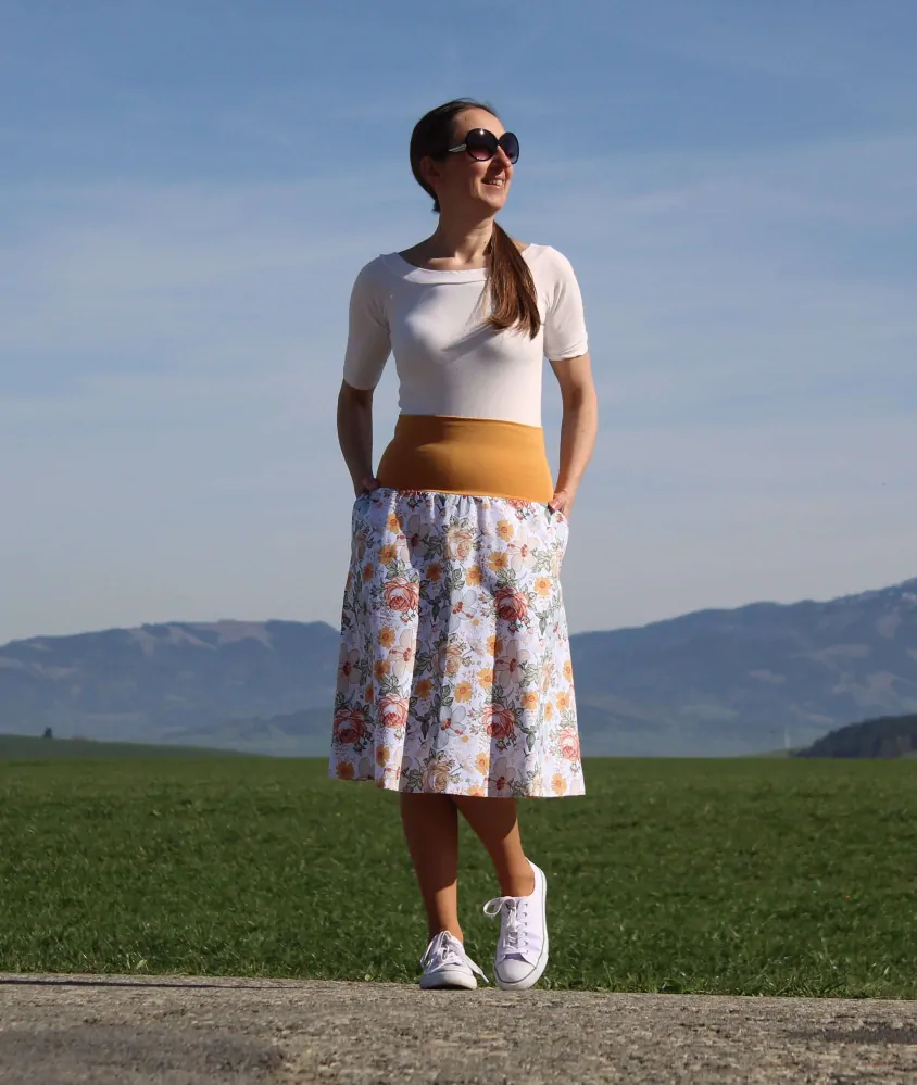 Sukňa je ušitá z bavlny bielej farby so vzorom kvetín. Je A-čkového strihu. V bočných švíkoch sú vsadené vrecká. V hornej časti je pružný úpletový pás, takže sa pekne prispôsobí postave.