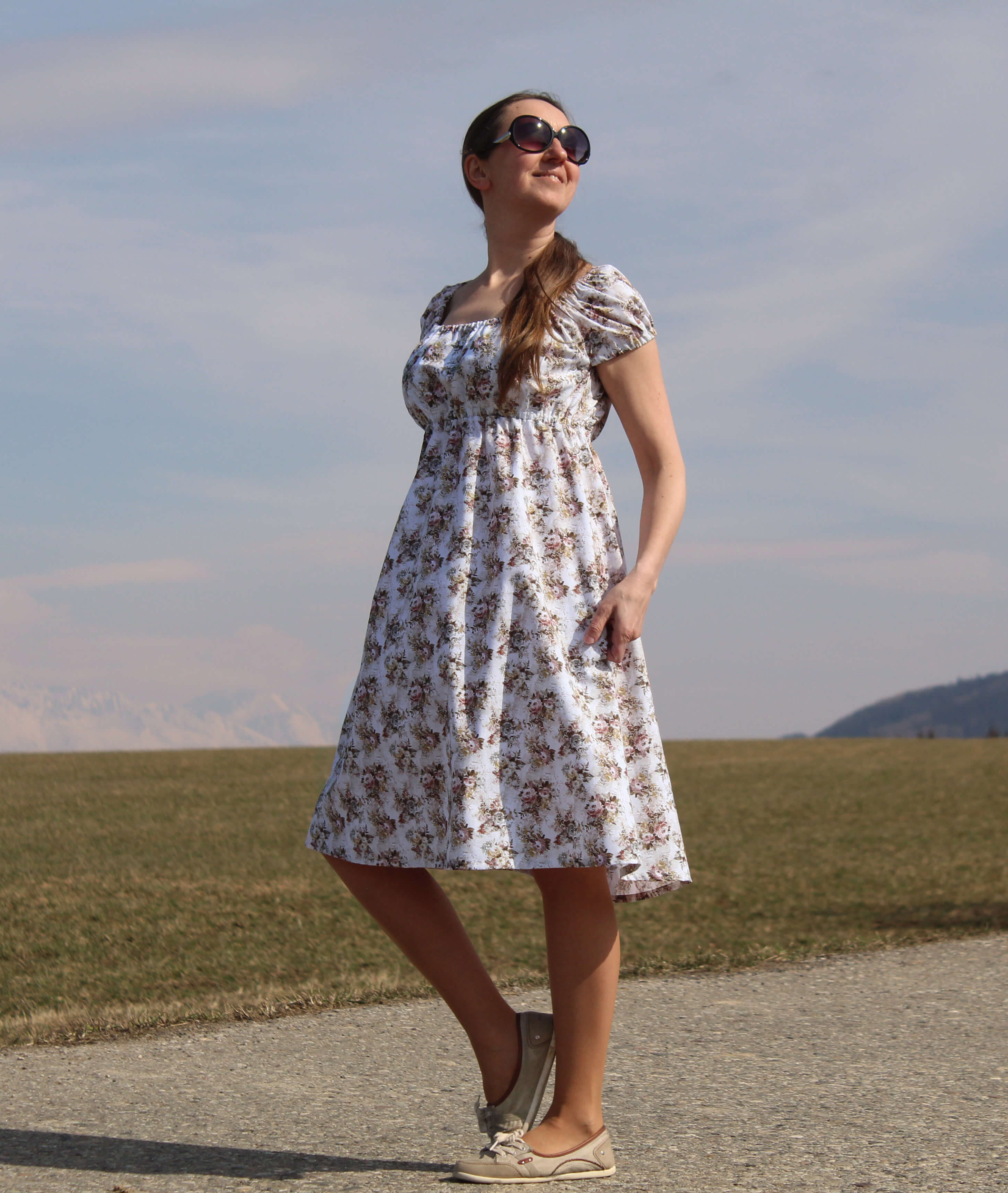 Šaty sú ušité tenučkej bavlny so vzorom kvetín. V hornej časti stiahnuté, pod prsiami a na rukávoch sú gumičky, šaty sa tak pekne prispôsobia postave. V bočných švíkoch sú skryté vrecká.