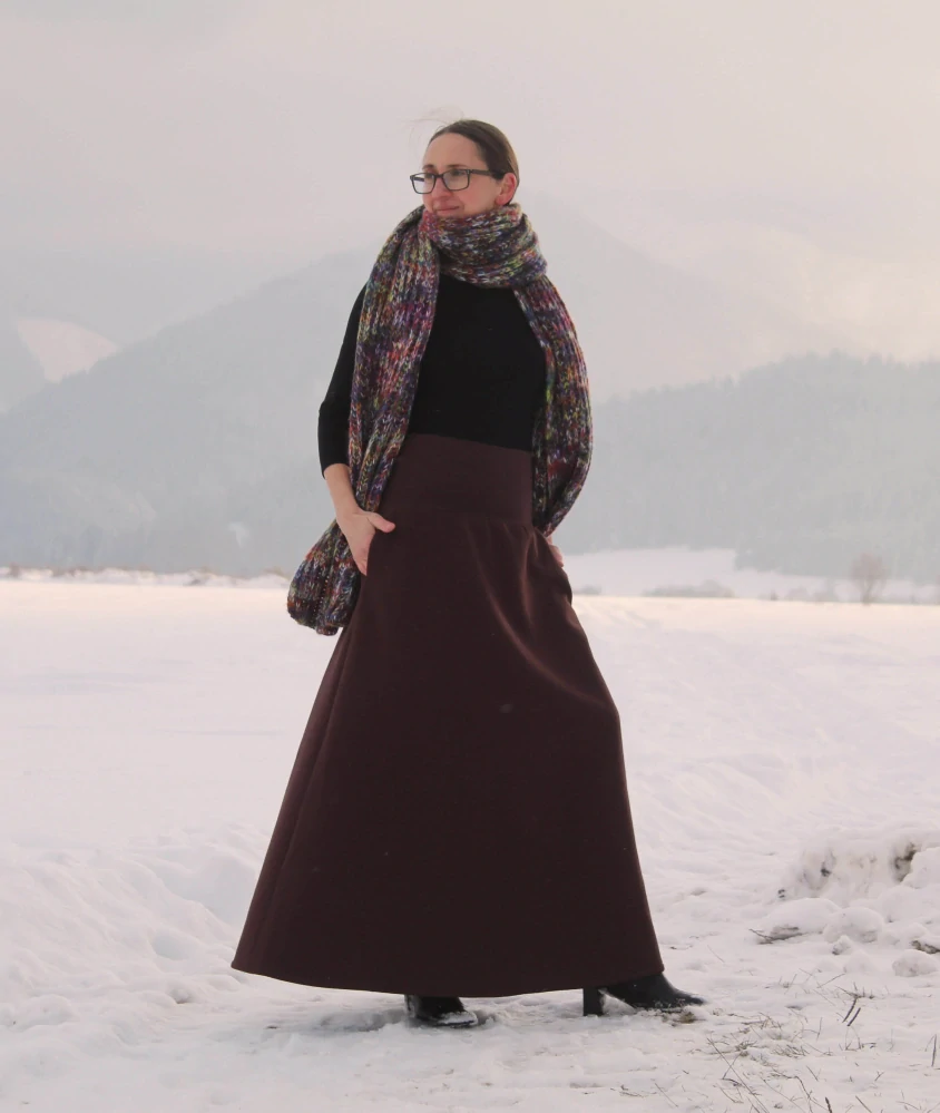 Táto hnedá áčková sukňa je ideálnym spoločníkom do chladnejšieho počasia. Je ušitá z počesanej bavlnenej teplákoviny, ktorá je na vnútornej strane jemne chlpatá a hrejivá, takže poskytuje príjemné teplo počas jesene a zimy.