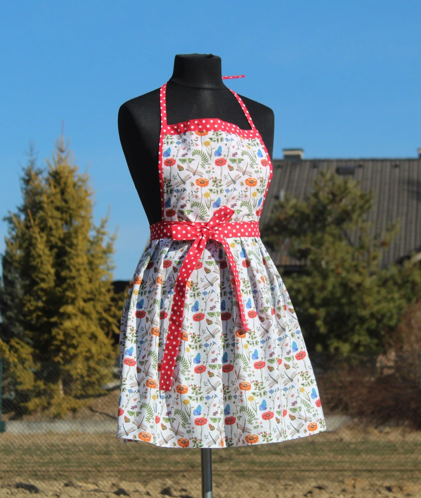 Bavlnená zásterka, v ktorej zažiarite aj v kuchyni. Zásterka má skladanú sukničku, ktorá pôsobí krásne a žensky. Biela bavlna so vzorom vlčích makov je dokombinovaná červenou bavlnou s bielymi bodkami, ktorá zásterku príjemne oživí. Pruh slúžiaci na uviazanie okolo pása je dostatočne dlhý, aby bola zástera vhodná pre všetky veľkosti. V hornej časti je zástera riešená dvomi užšími pásmi, ktoré slúžia na uviazanie okolo krku.