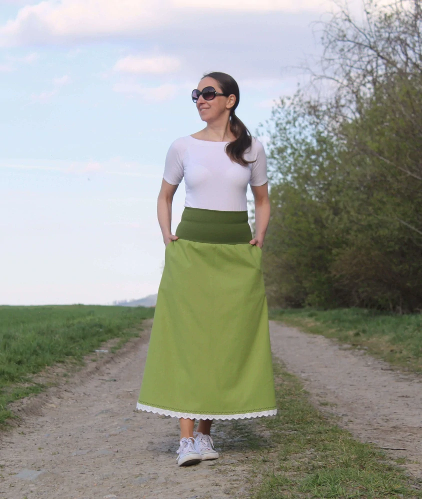 Táto dlhá áčková sukňa v jemnom svetlozelenom odtieni je romantickým a originálnym kúskom, ktorý zaujme na prvý pohľad. Vďaka svojmu prevedeniu pôsobí prirodzene, nežne a zároveň jedinečne – ideálna pre ženy, ktoré majú rady nadčasové oblečenie s jemným handmade charakterom.