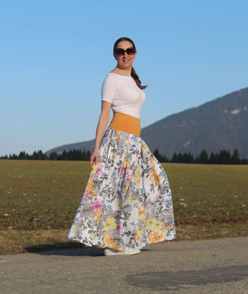 Táto dlhá bavlnená sukňa s jemným kvetinovým vzorom pôsobí nežne, žensky a veľmi elegantne. Svetlý podklad v kombinácii s pastelovými kvetmi vytvára svieži a romantický vzhľad, ktorý je ideálny na teplejšie dni.