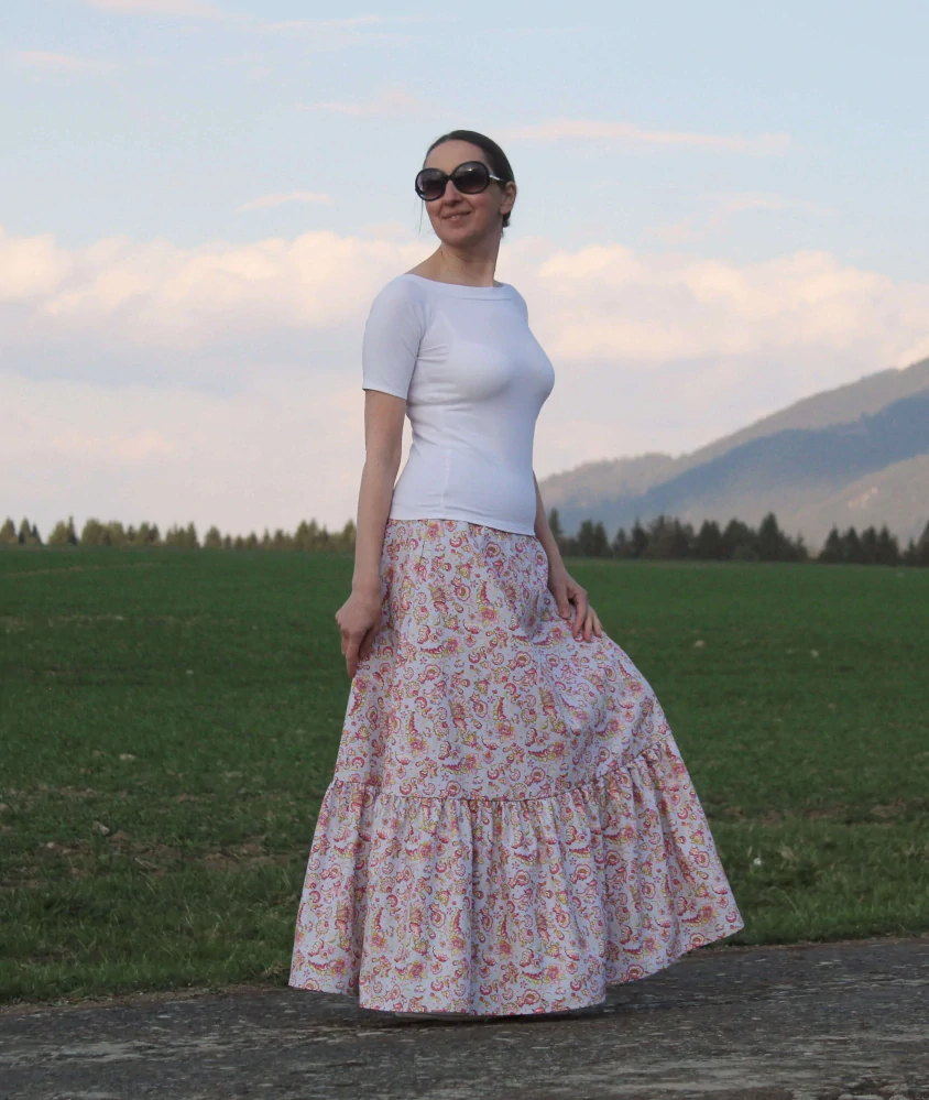 4. Dlhá bavlnená svetlošedá volánová sukňa s paisley vzorom