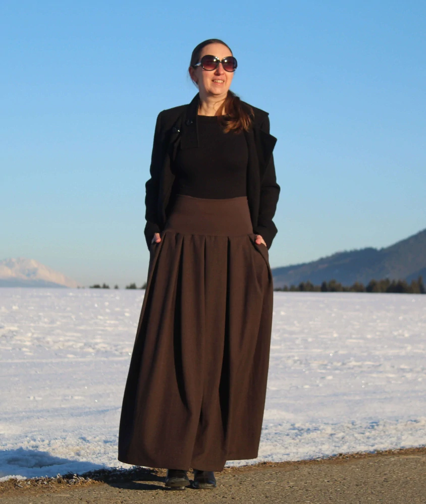 Sukňa je ušitá z príjemného stredne hrubého materiálu, ktorý je ideálny na prechodné obdobie aj mierne chladné dni. Hnedá farba s jemným károvaným vzorom pôsobí nadčasovo a sofistikovane, pričom vzor nie je príliš výrazný, takže sukňu ľahko skombinujete s rôznymi vrchnými časťami.