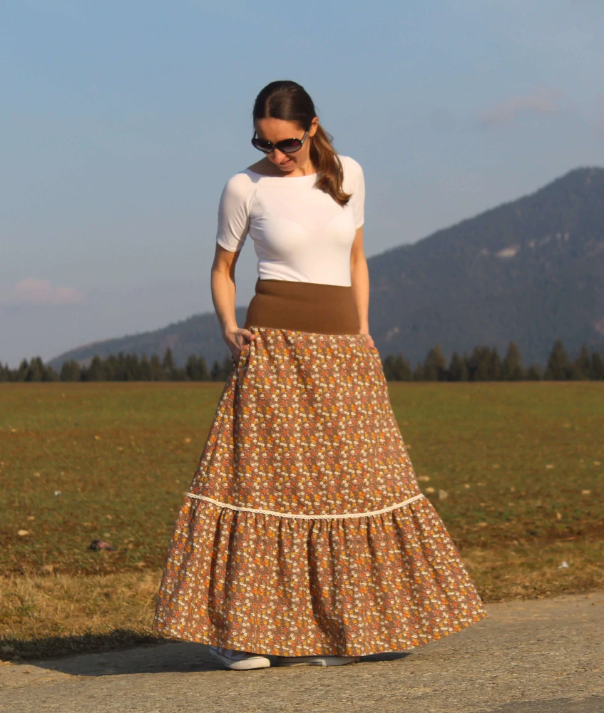Dlhá áčková sukňa z tenšieho pracieho kordu v hnedošedej farbe s drobným kvetinovým vzorom. V dolnej časti má široký volán so stuhou, vrecká a pružný pás. Vhodná na prechodné obdobie. celý popis