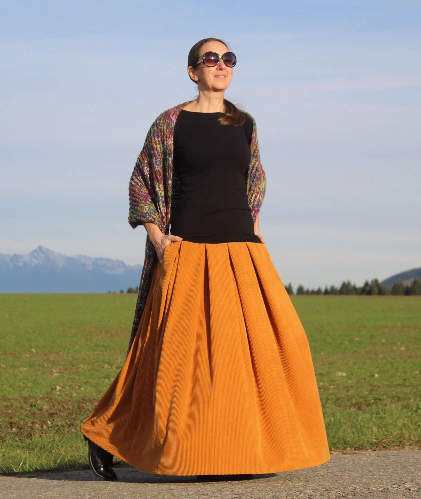 Táto dlhá karamelovo-hnedá sukňa je stvorená pre ženy, ktoré milujú pohodlie, eleganciu a prirodzený štýl. Ušitá je z hrubšej zmesovej kostýmovky, ktorá svojou jemnou rebrovanou štruktúrou pripomína menčester. Materiál je mäkký, poddajný, mierne elastický a krásne splýva s postavou.