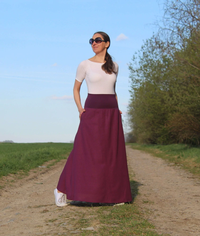 Táto dlhá áčková sukňa v slivkovo-fialovom odtieni je elegantným a zároveň pohodlným kúskom, ktorý využijete počas teplejších dní aj v prechodnom období. Vďaka áčkovému strihu sukňa krásne splýva, vytvára prirodzený pohyb pri chôdzi a pôsobí žensky a nadčasovo.