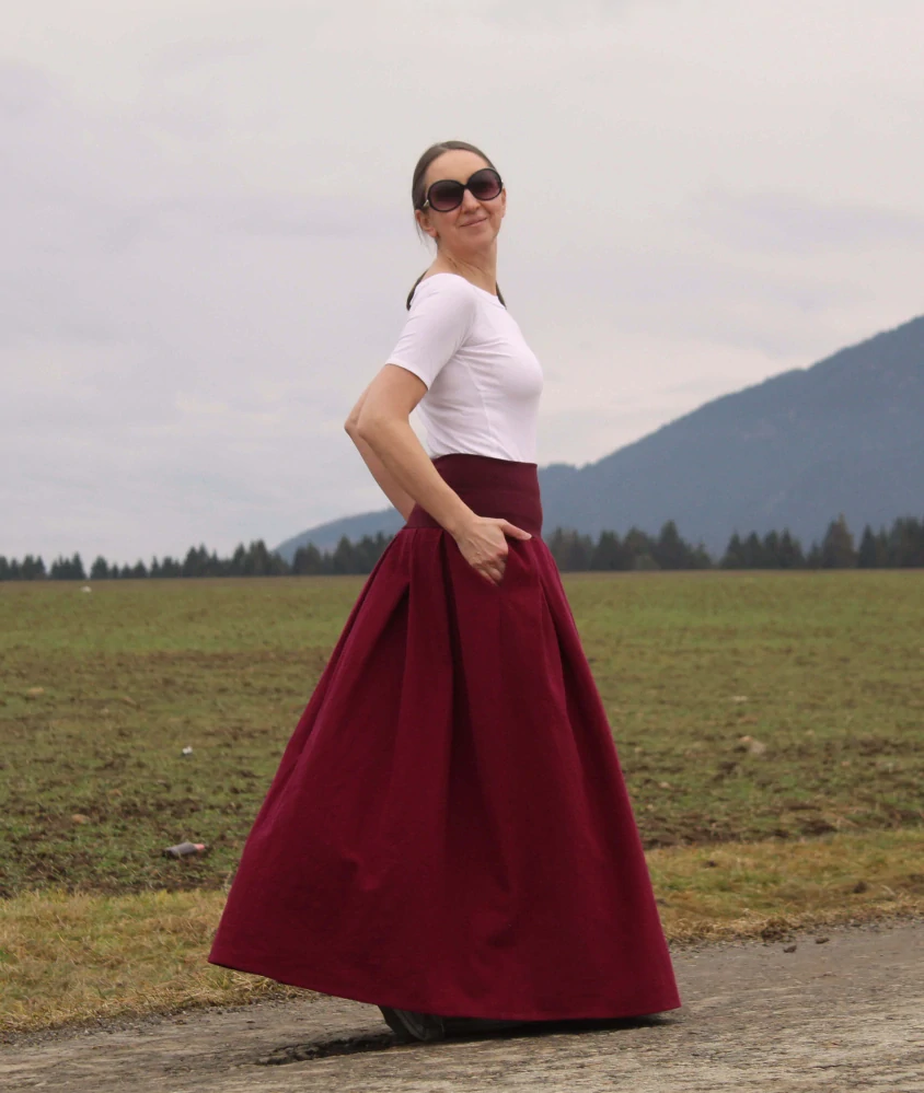 Táto dlhá skladaná sukňa zo 100 % ľanu v sýtej vínovej farbe je nadčasovým kúskom pre ženy, ktoré milujú prírodné materiály a čisté línie. Ušitá je z pevnejšieho ľanu s výraznejšou štruktúrou, ktorá krásne drží tvar a dodáva sukni charakter.