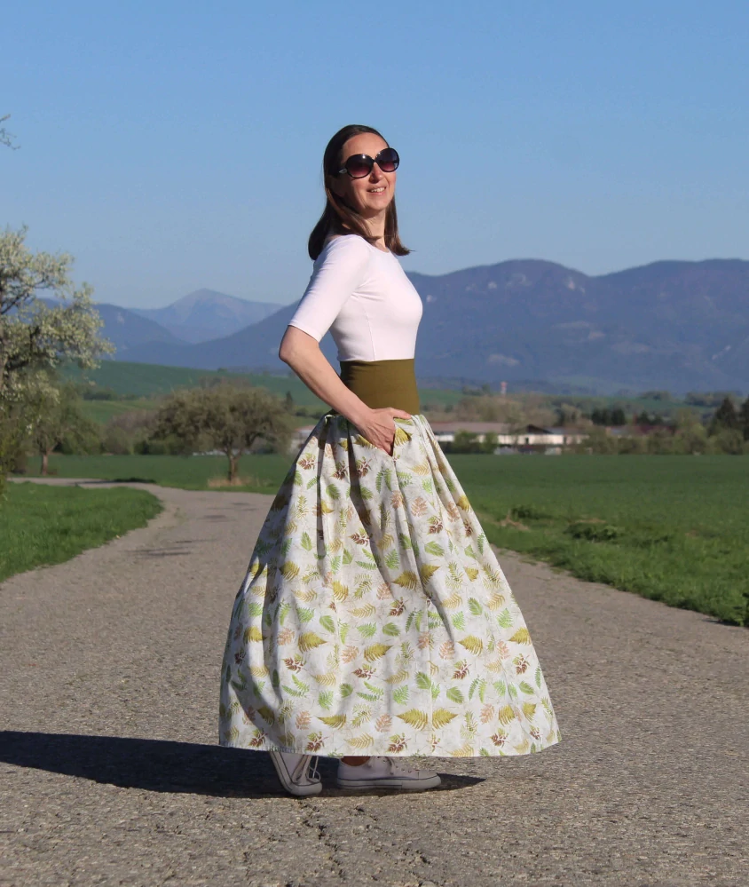 Elegantná, romantická, dlhá skladaná sukňa ušitá z dizajnového bavlneného popelínu so vzorom papradí. Sukňa je ľahučká, jemná a veľmi príjemá na nosenie. Je z čisto prírodného materiálu (100 % bavlna), čím je vzdušná a vhodná na teplé letné dni. Nosiť ju však môžete od jari do jesene.  V bočných švíkoch sú vsadené vrecká. V hornej časti je pružný úpletový pás, vďaka ktorému sa pekne prispôsobí postave.