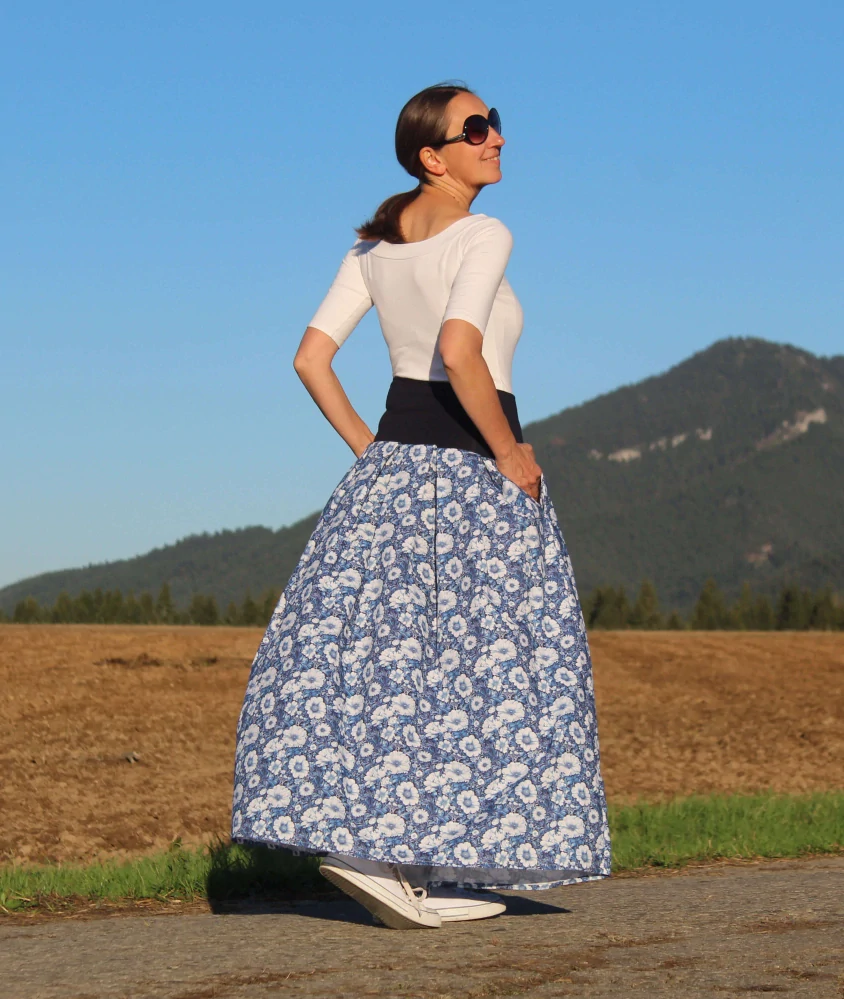 3. Dlhá skladaná sukňa modrá s bielymi kvetmi