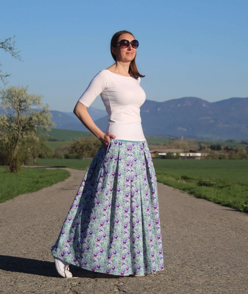Elegantná, romantická, dlhá skladaná sukňa ušitá z dizajnového bavlneného popelínu so vzorom kvetín. Sukňa je ľahučká, jemná a veľmi príjemá na nosenie. Je z čisto prírodného materiálu (100 % bavlna), čím je vzdušná a vhodná na teplé letné dni. Nosiť ju však môžete od jari do jesene. V bočných švíkoch sú vsadené vrecká. V hornej časti je pružný úpletový pás, vďaka ktorému sa pekne prispôsobí postave.