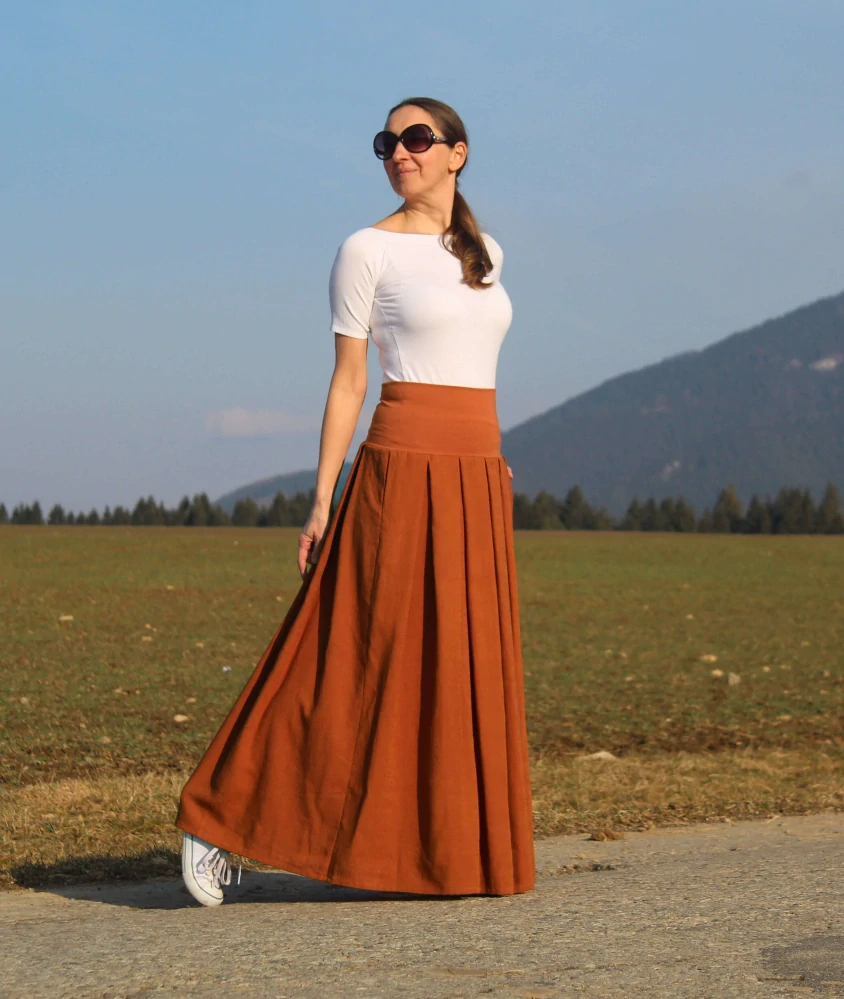 Táto dlhá sukňa v teplom škoricovo-hnedom odtieni je ušitá zo zmesového ľanu (ľan + viskóza). Materiál je príjemne mäkký, prirodzene padavý a v tomto vyhotovení o niečo tenší, čo z nej robí ideálny kúsok aj na chladnejšie letné dni.