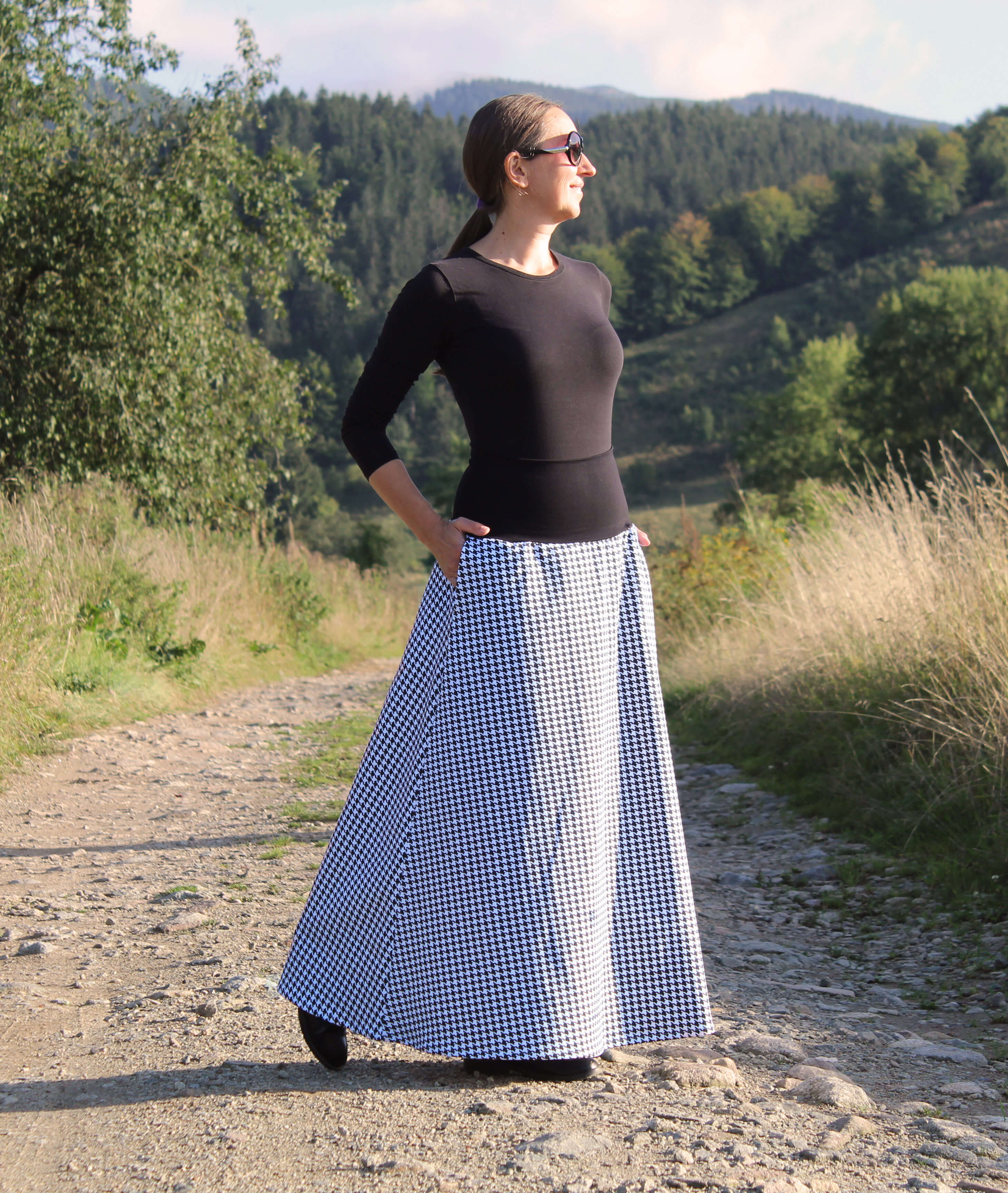 Sukňa je ušitá z bavlnenej teplákoviny so vzorom pepitka. Je A-čkového strihu, v hornej časti je bavlnený pružný pás. Elastický materiál sa pekne prispôsobí postave. V bočných švíkoch sú všité vrecká. Vďaka príjemnému prírodnému elastickému materiálu je sukňa pohodlná a nekrčivá. Je vhodná na prechodné i zimné obdobie.