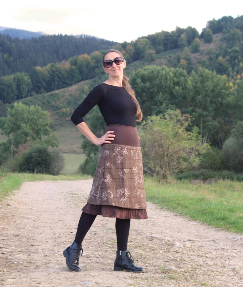 3. Hnedá dvojvrstvová sukňa s vyšívanými kvetmi
