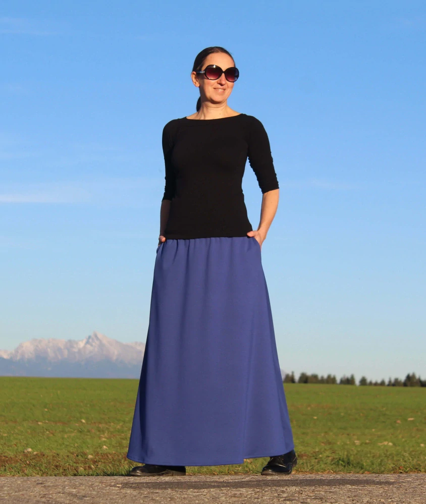 Táto kráľovsky modrá áčková sukňa je spojenie nadčasovej elegancie a pohodlia. Ušitá je z úpletu Punto Milano s podielom viskózy – materiálu, ktorý je jemný, hladký, hrejivý a má výbornú tvarovú stálosť.