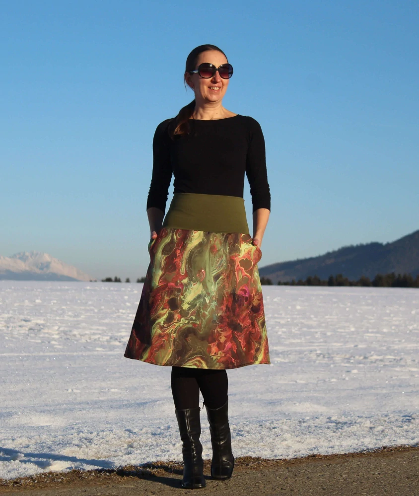 Krátka áčková sukňa zo vzorovaného softshellu je praktickým a štýlovým kúskom, ktorý sa hodí na bežné každodenné nosenie aj na zimné voľnočasové aktivity. Áčkový strih je pohodlný, lichotivý k postave a umožňuje voľný pohyb.