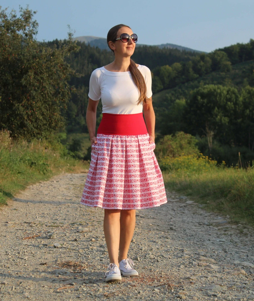 Sukňa je ušitá z príjemnej bavlny červeno-bielej farby s folklórnym vzorom. V bočných švíkoch sú vsadené vrecká. V hornej časti je pružný úpletový pás, takže sa pekne prispôsobí postave.