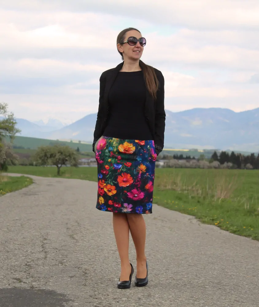 Sukňa je ušitá z dizajnového bavlneného úpletu. Je rovného strihu, v bočných švíkoch sú všité vrecká. Sukňa je elastická, takže sa pekne prispôsobí postave. Je možné ju nosiť aj ako športovú aj ako elegantnú.