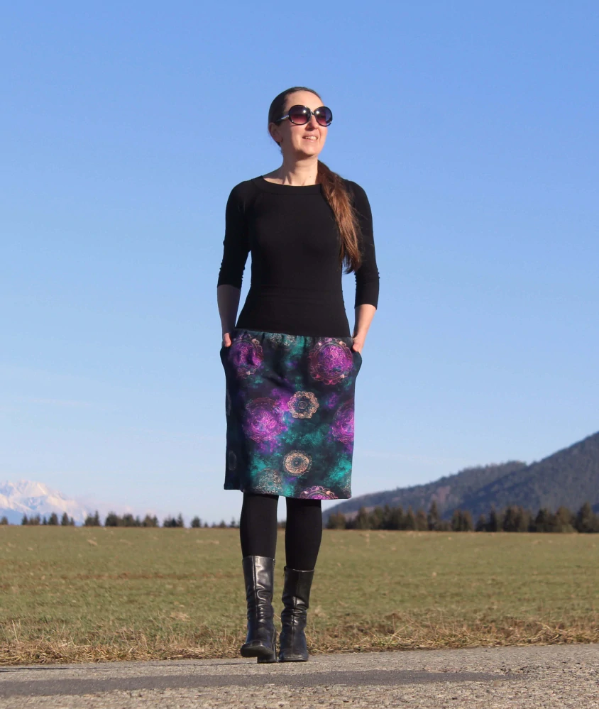 Sukňa je ušitá z dizajnovej bavlnenej teplákoviny. Je rovného strihu, v bočných švíkoch sú všité vrecká. Sukňa je elastická, takže sa pekne prispôsobí postave. Je možné ju nosiť aj ako športovú aj ako elegantnú.