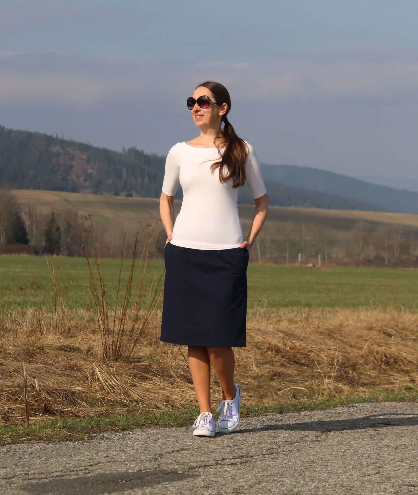 Sukňa je ušitá z bavlnenej teplákoviny. Je rovného strihu, v bočných švíkoch sú všité vrecká. Sukňa je elastická, takže sa pekne prispôsobí postave. Je možné ju nosiť aj ako športovú aj ako elegantnú.