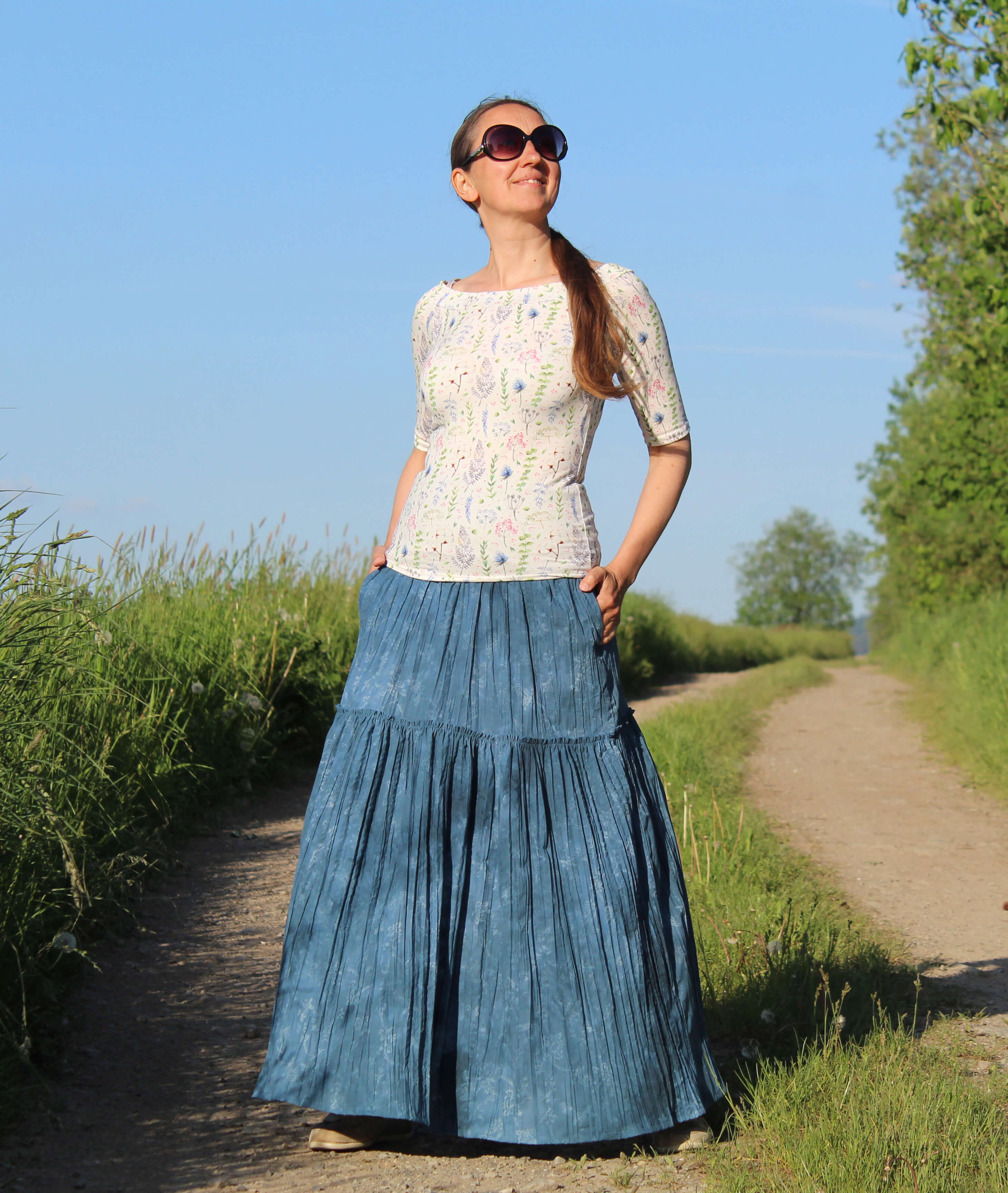 Sukňa je ušitá zo zmesovej šatovky modrej farby. Horná časť sukne je riasená, doplnená a volán. V bočných švíkoch sú vsadené vrecká. V hornej časti je pružný úpletový pás, takže sa pekne prispôsobí postave.  Materiál je nepriesvitný, batikovaný s krešovanou úpravou, vďaka ktorej nie je potrebné sukň... celý popis