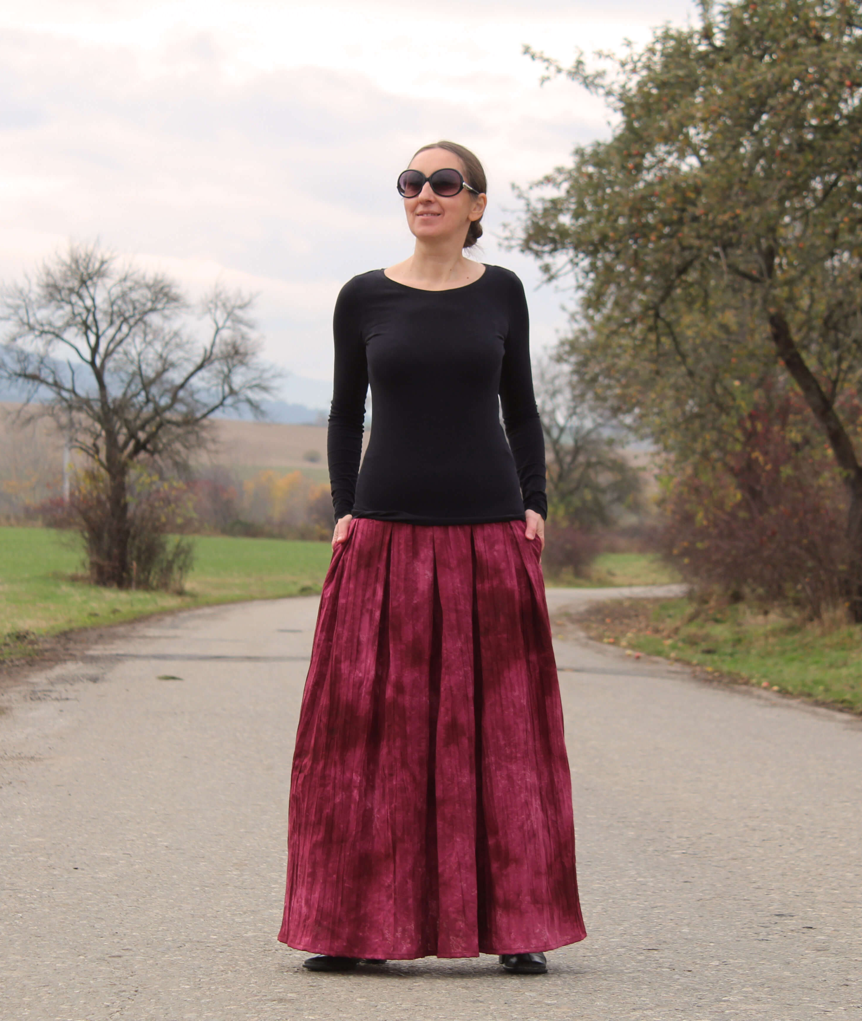 Sukňa je ušitá zo zmesovej šatovky vínovej farby. Je skladaná. V bočných švíkoch sú vsadené vrecká. V hornej časti je pružný úpletový pás, takže sa pekne prispôsobí postave.