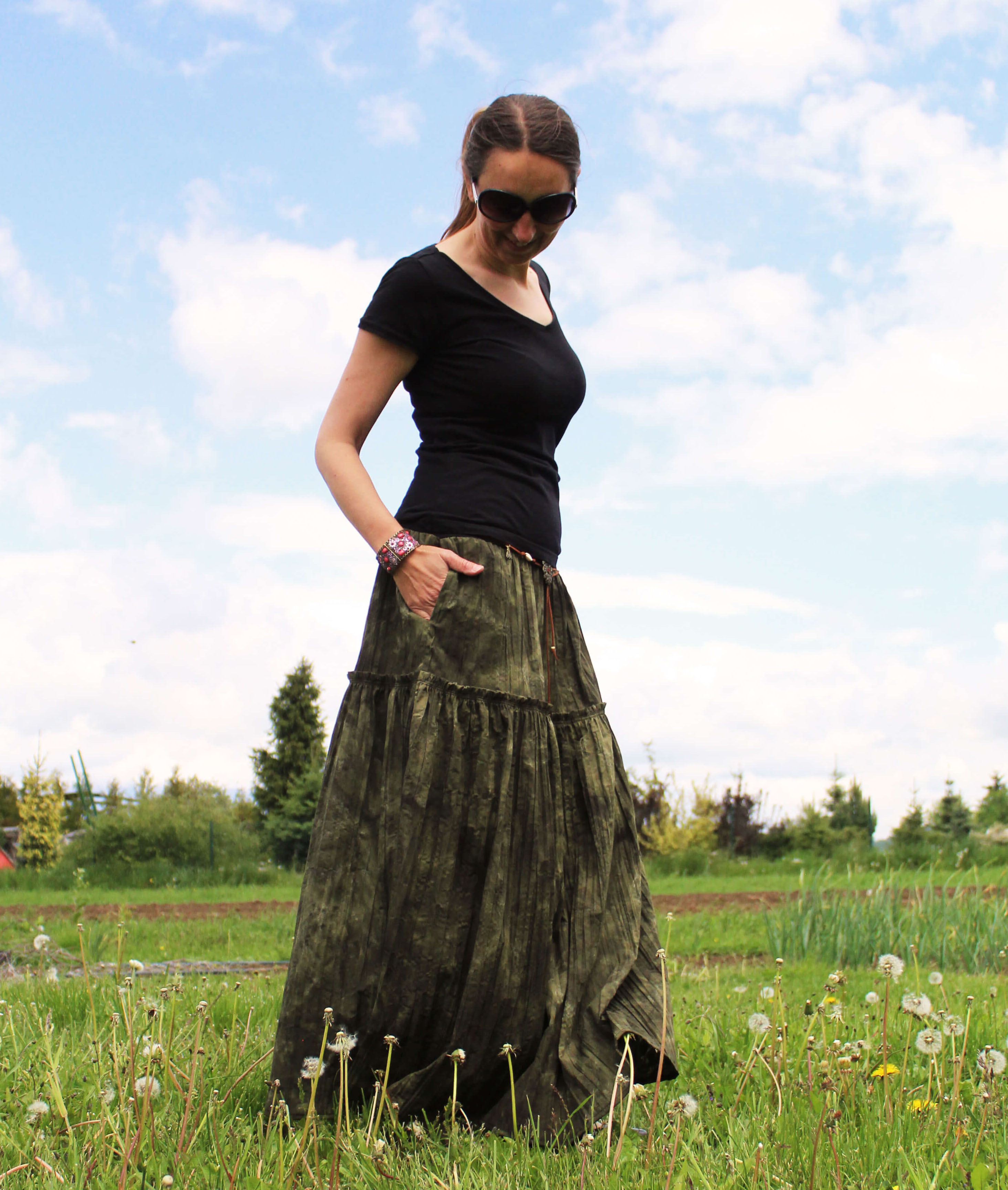 Sukňa je ušitá zo zmesovej šatovky zelenej farby. Horná časť sukne je riasená, doplnená a volán. V bočných švíkoch sú vsadené vrecká. V hornej časti je pružný úpletový pás, takže sa pekne prispôsobí postave.  Materiál je nepriesvitný, batikovaný s krešovanou úpravou, vďaka ktorej nie je potrebné suk... celý popis