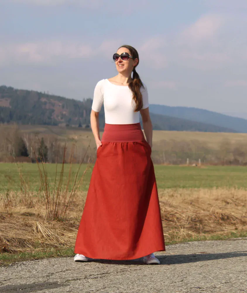 Sukňa je ušitá zo 100 % ľanu tehlovej farby. Je A-čkového strihu. V bočných švíkoch sú vsadené vrecká. V hornej časti je pružný úpletový pás, takže sa pekne prispôsobí postave.