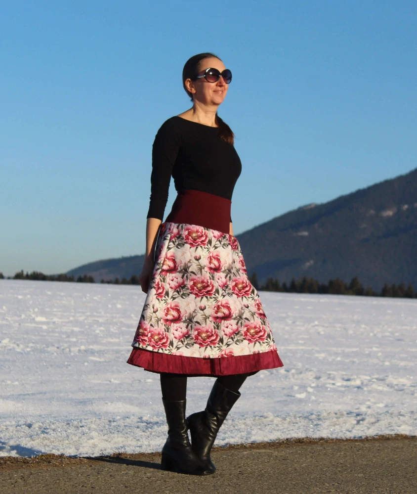 Sukňa má pružný pás vo vínovej farbe, ktorý farebne ladí s podšívkou aj vzorom a zabezpečuje maximálne pohodlie pri nosení. Vďaka dvojvrstvovému prevedeniu je sukňa teplá a ideálna na zimné obdobie.