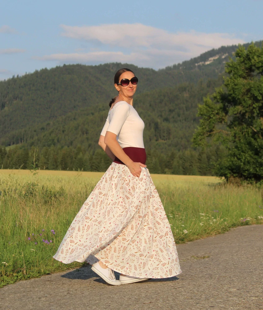 Dlhá, ľahká a vzdušná skladaná sukňa, ušitá z bavlnenej dvojitej gázoviny (bavlneného mušelínu). Sukňa je veľmi príjemná na nosenie, nakoľko materiál z ktoréhu je ušitá je čisto prírodný a na dotyk mäkkučký. Sukňa je vysoko priedušná, čo oceníte najmä počas leta. Tým, že má materiál prirodzene krčivý vzhľad, nie je nutné ju žehliť. Vyšší komfort zabezpečujú vrecká, ktoré sú všité v bočných švíkoch. V hornej časti je pružný, takže sa pekne prispôsobí postave. Sukňa je bielej farby so vzorom lístkov v odtieňoch vínovej a vínovofialovej farby.