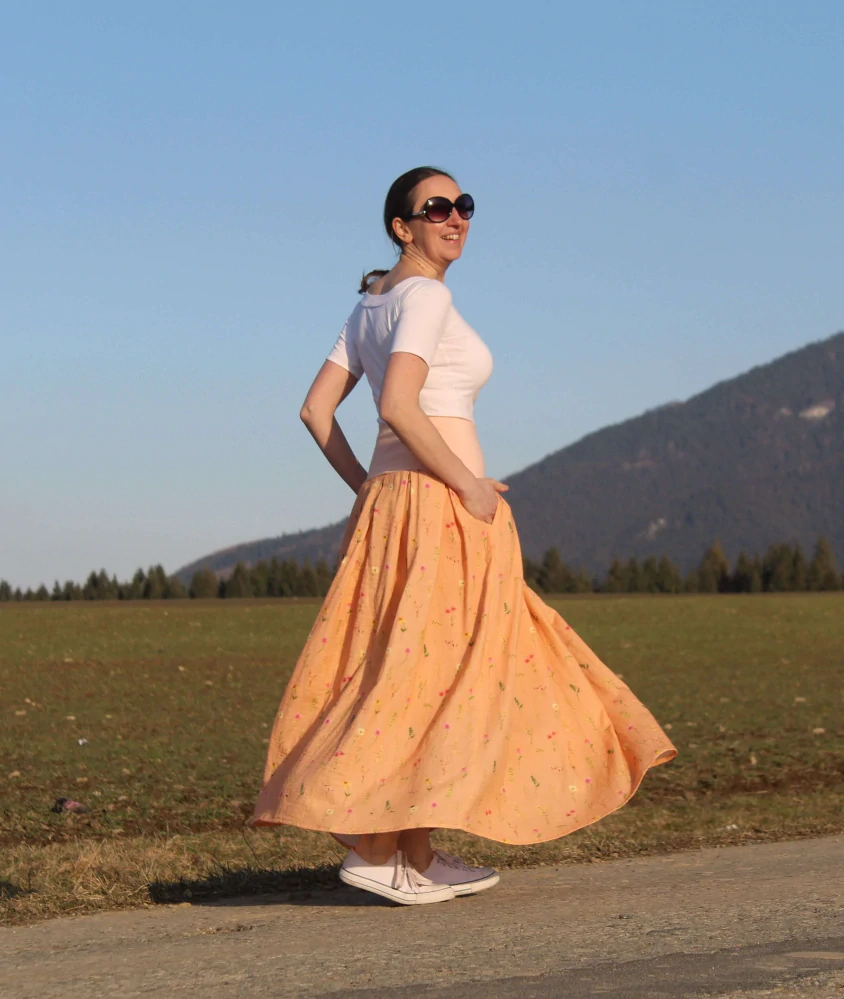 Táto dlhá skladaná mušelínová sukňa v jemnom marhuľovom odtieni s drobným kvetinovým vzorom pôsobí nežne, sviežo a veľmi žensky. Je ušitá z ľahkého bavlneného mušelínu, ktorý je prirodzene priedušný, mäkký na dotyk a veľmi príjemný na nosenie najmä počas teplejších dní.