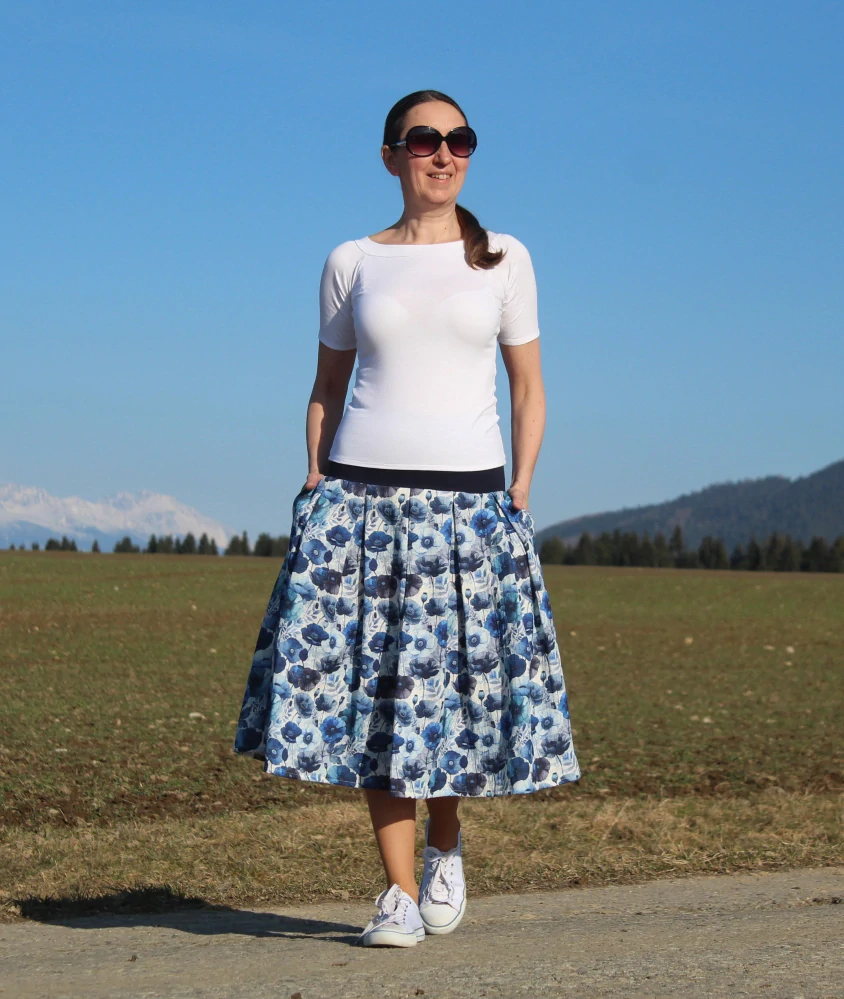 Skladaný strih dodáva sukni objem a umožňuje látke prirodzene splývať a pohybovať sa pri chôdzi. Svetlý podklad s modrými kvetmi pôsobí sviežo a nadčasovo, pričom modré tóny vytvárajú harmonický a elegantný vzhľad.