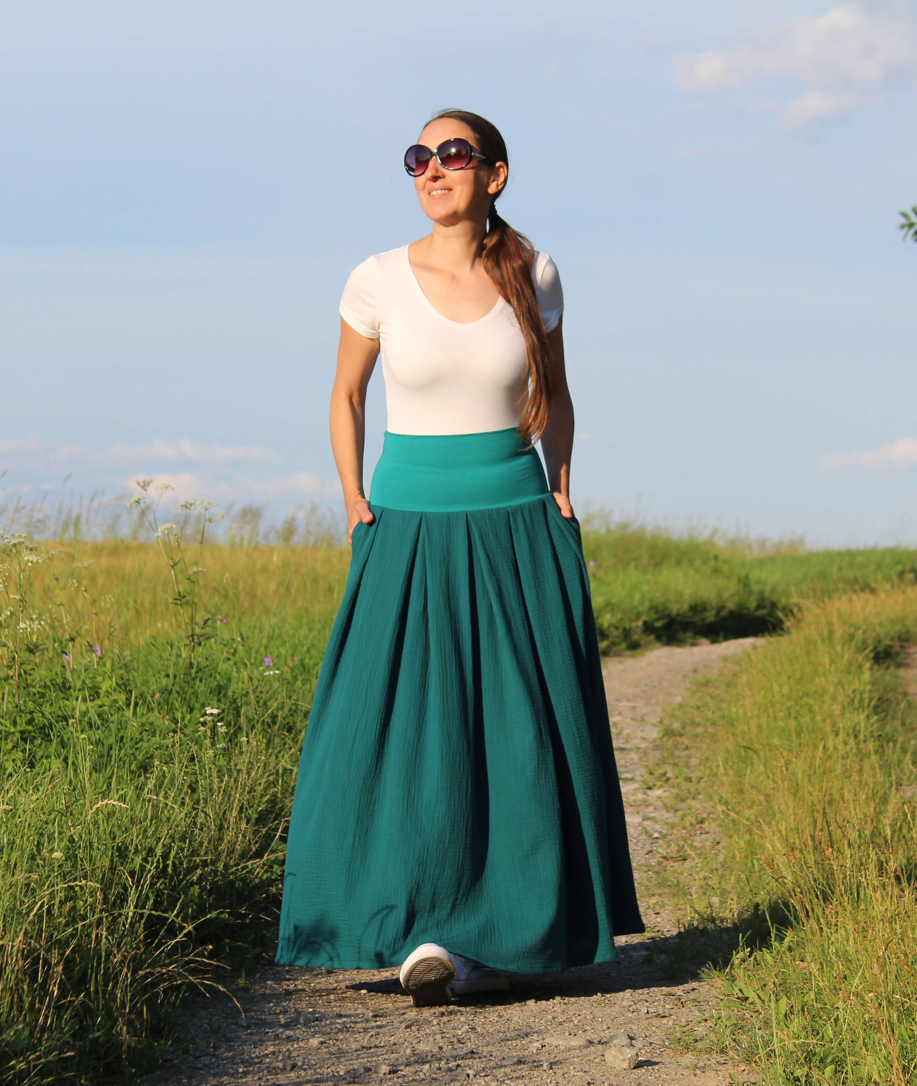 Sukňa je ušitá z dvojitej gázoviny (bavlneného mušelínu) tyrkysovej farby. Je skladaná. V bočných švíkoch sú vsadené vrecká. V hornej časti je pružný úpletový pás, takže sa pekne prispôsobí postave.