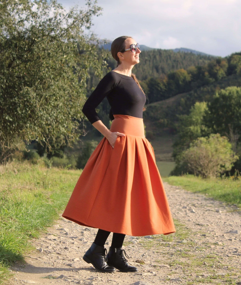 Sukňa je ušitá z bavlneného úpletu s waflovou väzbou škoricovej farby. Je skladaná. V bočných švíkoch sú vsadené vrecká. V hornej časti je pružný úpletový pás, takže sa pekne prispôsobí postave.