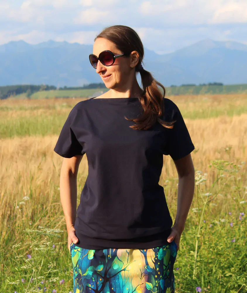Elegantné a pohodlné tričko ušité z bavlneného úpletu (95 % bavlna, 5 % elasten). Tričko je voľného strihu, v hornej časti má lodičkový výstrih a v dolnej časti patent.