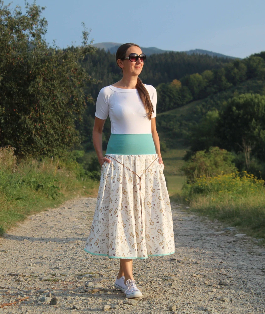 Sukňa je ušitá z dvojitej gázoviny (bavlneného mušelínu). Je skladaná. V bočných švíkoch sú vsadené vrecká. V hornej časti je pružný úpletový pás, takže sa pekne prispôsobí postave. Dozdobená je na spodnom okraji madeirou a opskom.