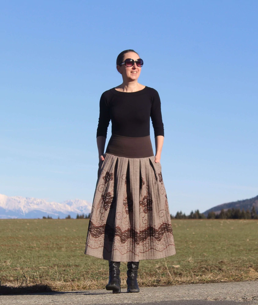 4. Trojštvrťová hnedá sukňa s bordúrou