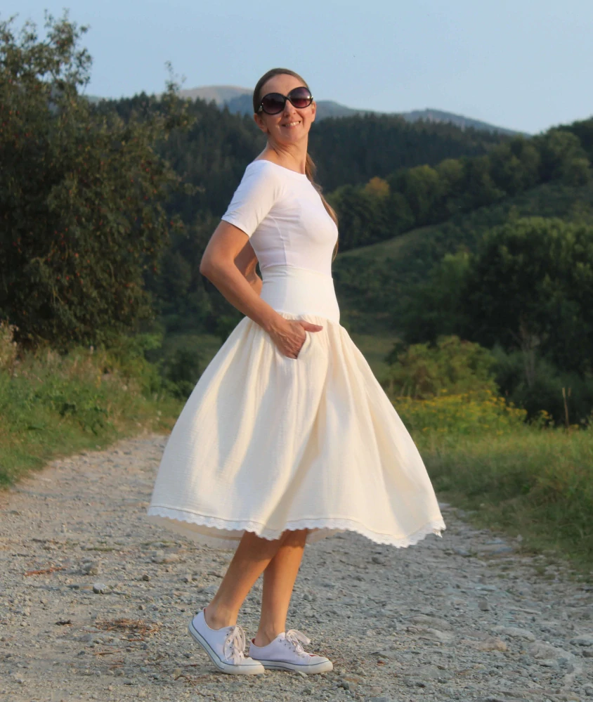 Sukňa je ušitá z dvojitej gázoviny (bavlneného mušelínu) smotanovej farby. Je riasená. V bočných švíkoch sú vsadené vrecká. V hornej časti je pružný úpletový pás, takže sa pekne prispôsobí postave. Dozdobená je na spodnom okraji madeirou. Mušelín je 100 % bavlna, ktorá je oproti klasickej bavlne jem... celý popis