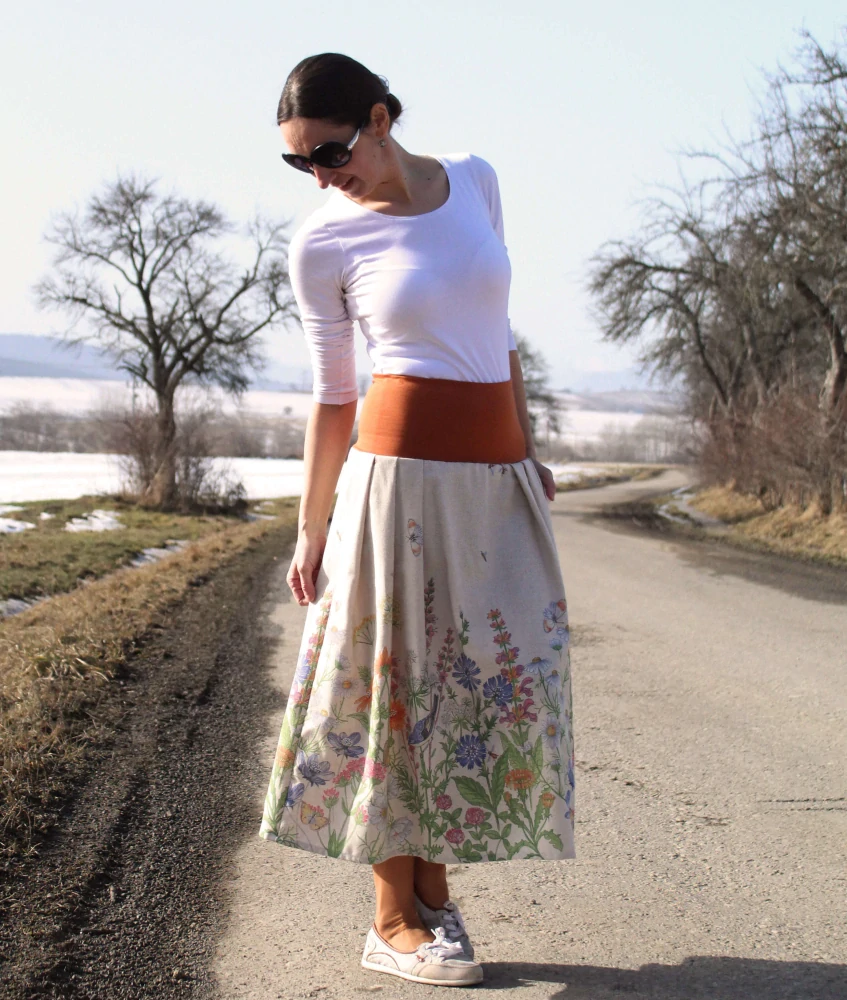 Trojštvrťová sukňa ušitá z pevnejšej dizajnovej zmesovej bavlny režnej farby s bordúrovým vzorom lúčnych kvetín. Pevnejší materiál a voľný strih so skladmi po bokoch dodávajú sukni veľmi pekný vzhľad. Vďaka farebnej kombinácii a jednoduchému strihu je sukňa nadčasová a veľmi dobre kombinovateľná s iným oblečením. Vyšší komfort zabezpečujú vsadené vrecká v bočných švíkoch. V hornej časti je pružný úpletový pás, ktorý sa pekne prispôsobí postave a čiastočne ju aj vytvaruje. Vďaka zloženiu materiálu je sukňa menej krčivá.