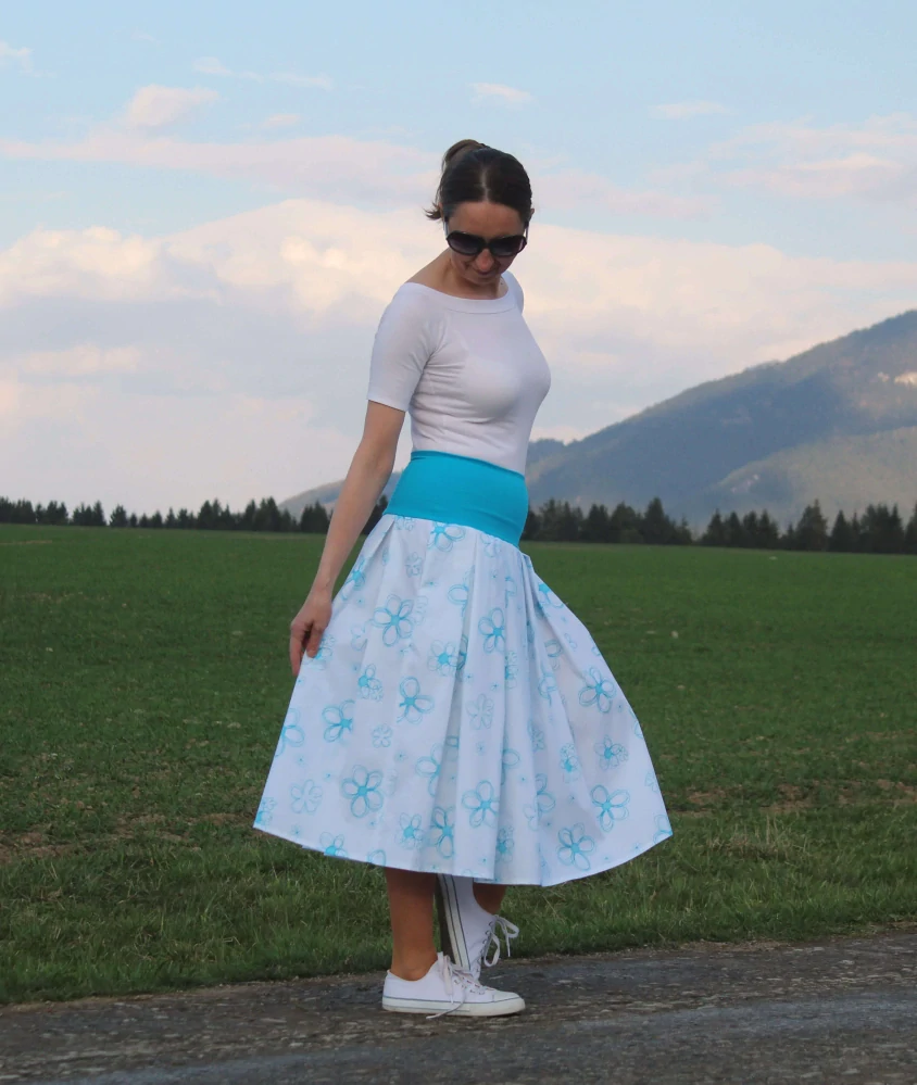 Táto trojštvrťová sukňa s jemným kvetinovým vzorom v tyrkysových odtieňoch pôsobí sviežo, žensky a ideálne doplní letný šatník. Vďaka skladanému strihu sukňa krásne drží tvar, vytvára prirodzený pohyb pri chôdzi a pôsobí ľahko a vzdušne.