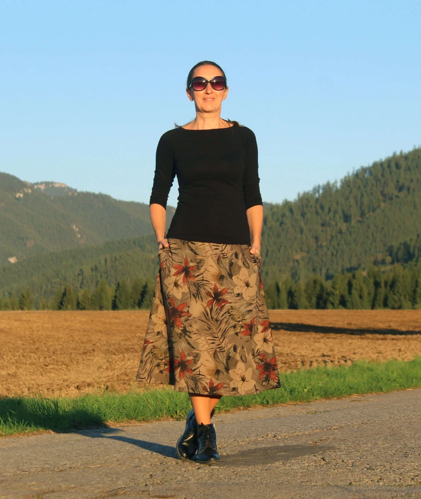 Praktická a pohodlná trojštvrťová sukňa je ušitá z elasitickej rifľoviny vojensky zelenej farby so vzorom kvetín. Sukňa je pohodlná, príjemná a vďaka pridanému elastenu je pruživá. Sukňa je A-čkového strihu, ktorý pekne vytvaruje postavu. V bočných švíkoch sú vsadené vrecká.