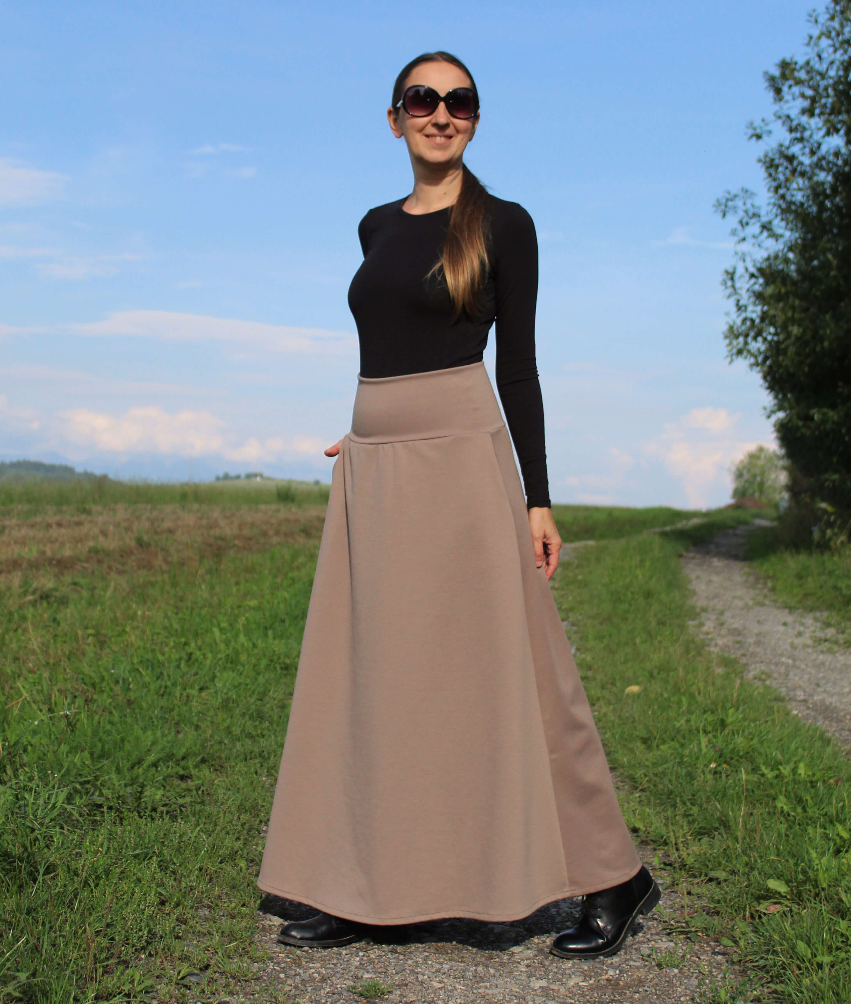 Sukňa je ušitá z príjemného viskózového úpletu béžovej farby. Je A-čkového strihu. V bočných švíkoch sú vsadené vrecká. V hornej časti je pružný úpletový pás, takže sa pekne prispôsobí postave. Sukňa je veľmi pohodlná na nosenie. Vhodná na prechodné a zimné obdobie.