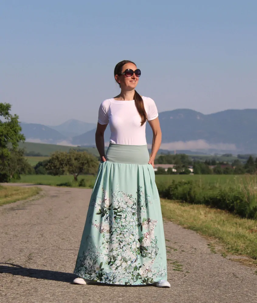 Sukňa je ušitá z príjemného bavlneného úpletu s borúrovým vzorom kvetín. Je voľného strihu so skladmi na bokoch. V bočných švíkoch sú vsadené vrecká. V hornej časti je pružný úpletový pás, takže sa pekne prispôsobí postave.