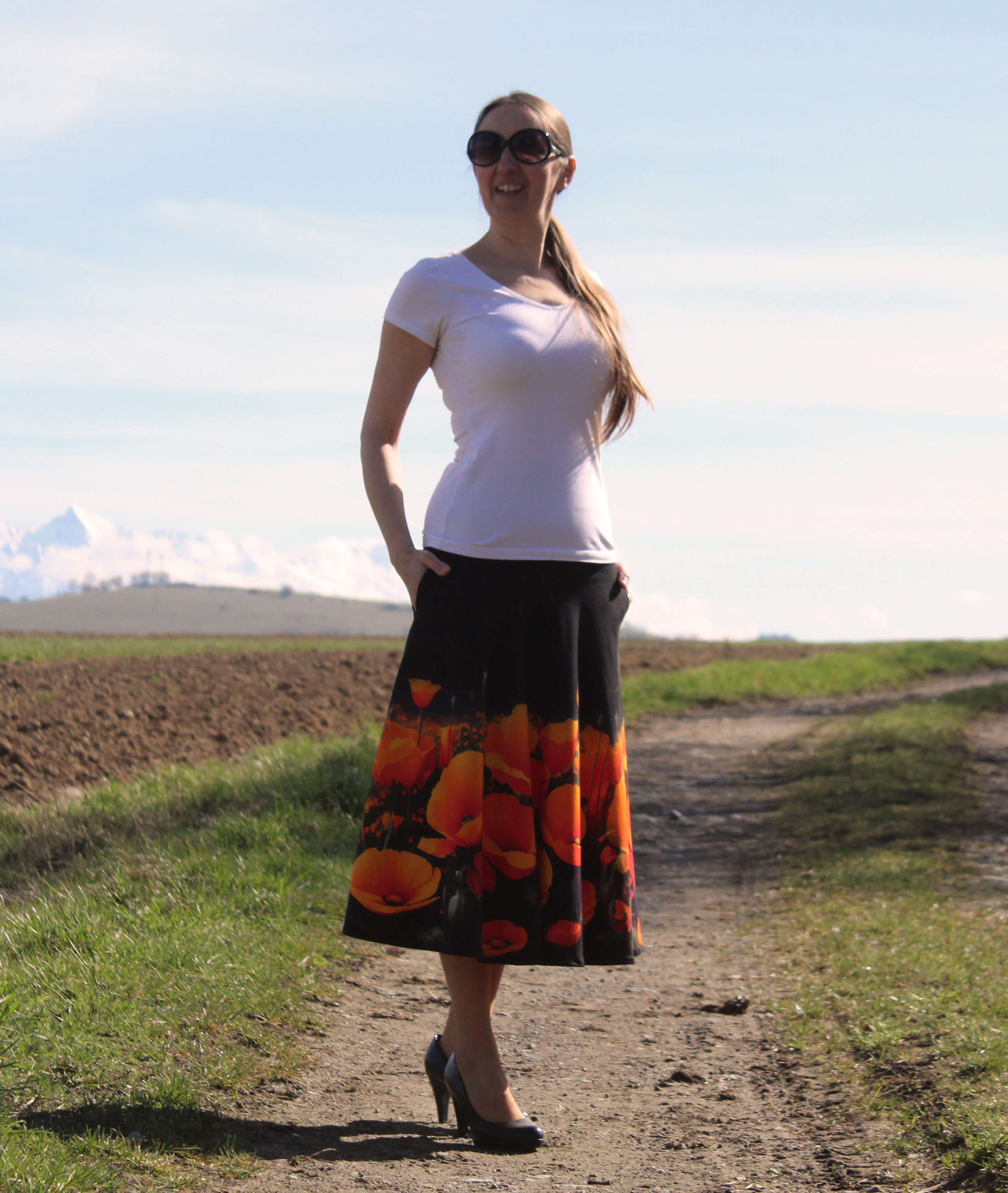 Sukňa je ušitá z príjemného bavlneného úpletu čiernej farby so vzorom kalifornských makov. Je polkruhová. V bočných švíkoch sú vsadené vrecká. V hornej časti je pružný úpletový pás, takže sa pekne prispôsobí postave.