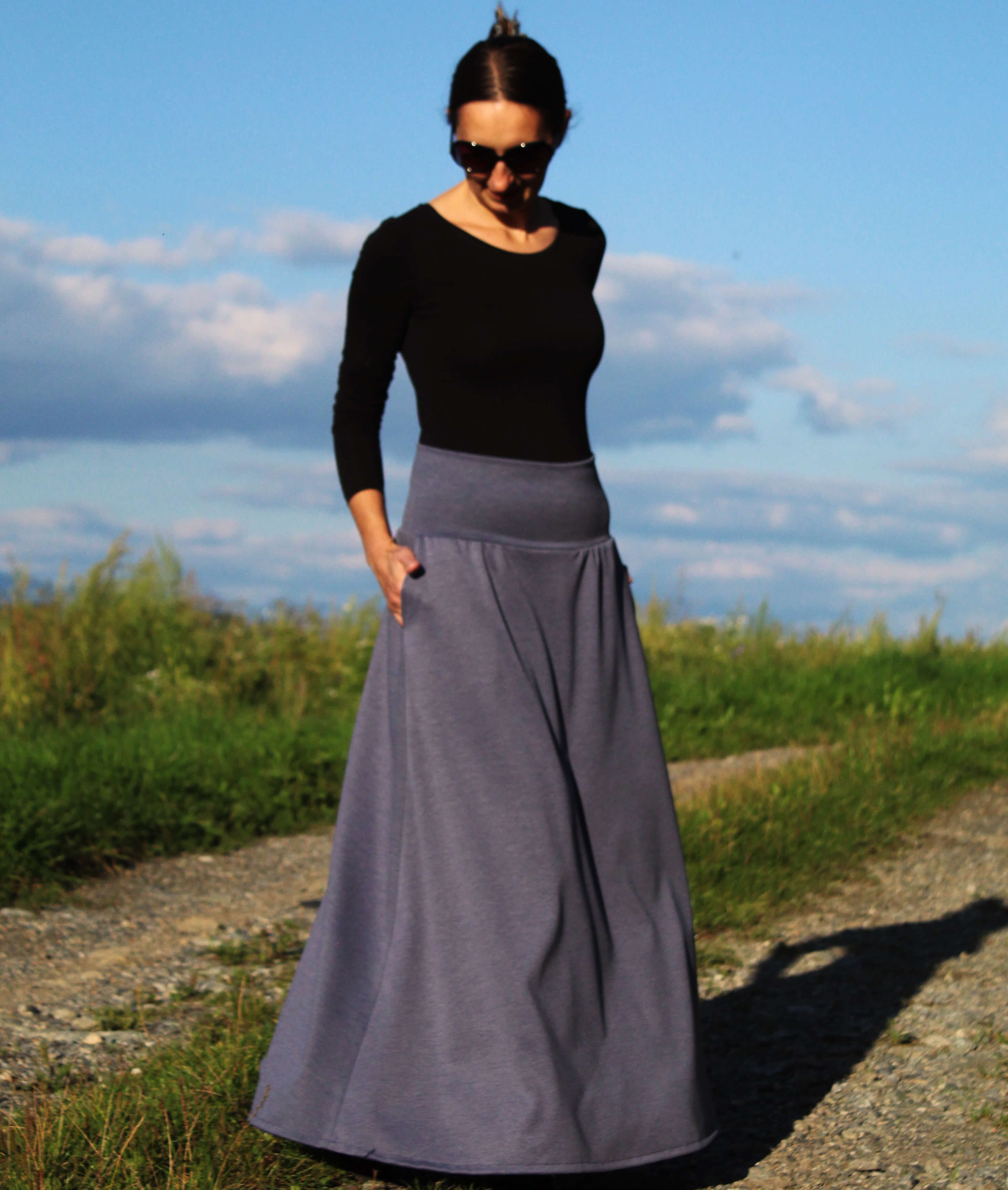 Sukňa je ušitá z príjemného viskózového úpletu šedomodrej farby (denim).  Je A-čkového strihu. V bočných švíkoch sú vsadené vrecká. V hornej časti je pružný úpletový pás, takže sa pekne prispôsobí postave. Sukňa je veľmi pohodlná na nosenie. Vhodná na prechodné a zimné obdobie.