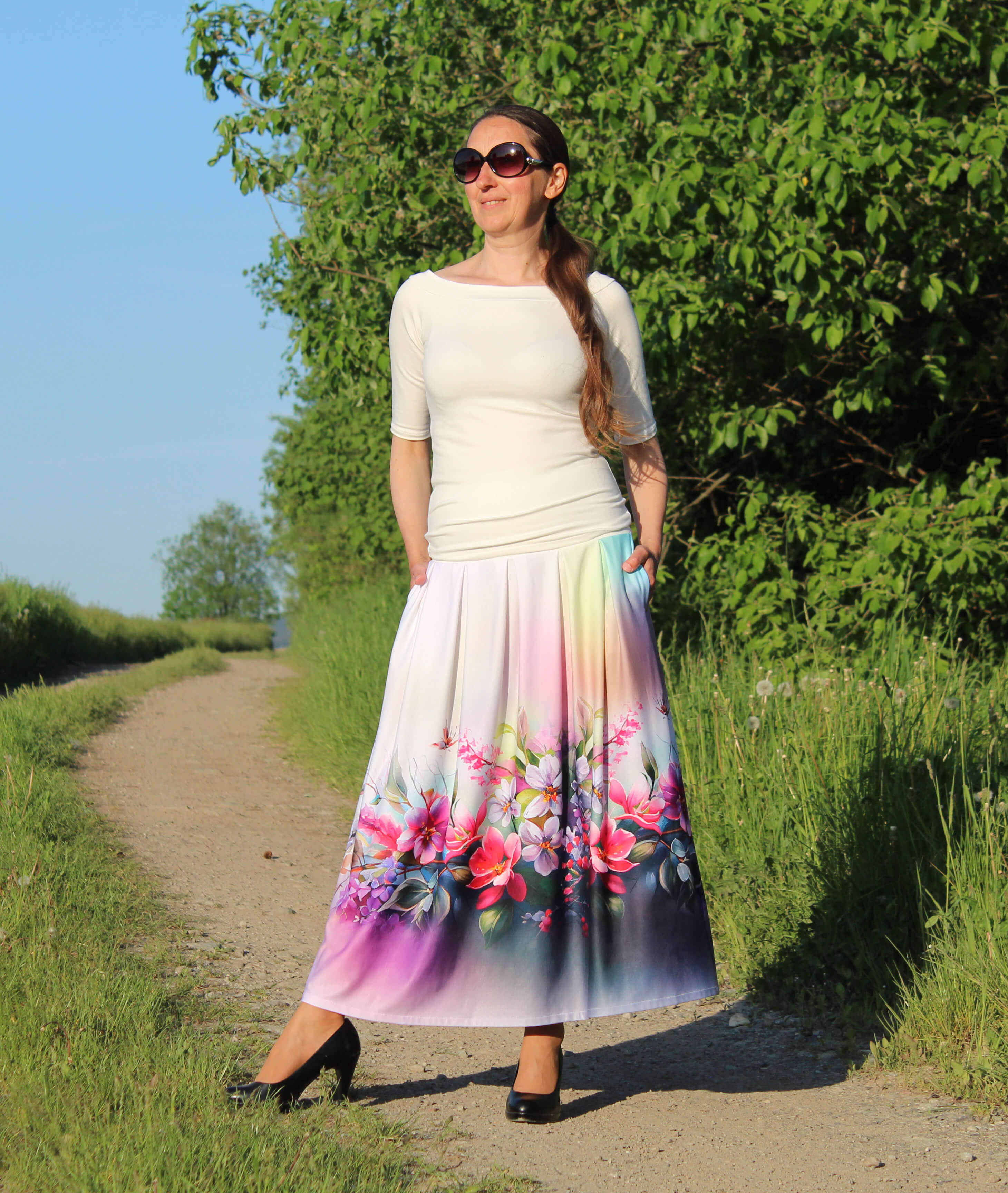 Dlhá elegantná skladaná sukňa je ušitá z príjemného šlachteného polyesterového úpletu (94 % polyester, 6 % elasten). Materiál je veľmi príjemný, je savý, pružný, priedušný, ľahký, nežmolkuje sa, nesráža sa. V bočných švíkoch sú vsadené vrecká. V hornej časti je pružný úpletový pás, takže sa pekne prispôsobí postave.