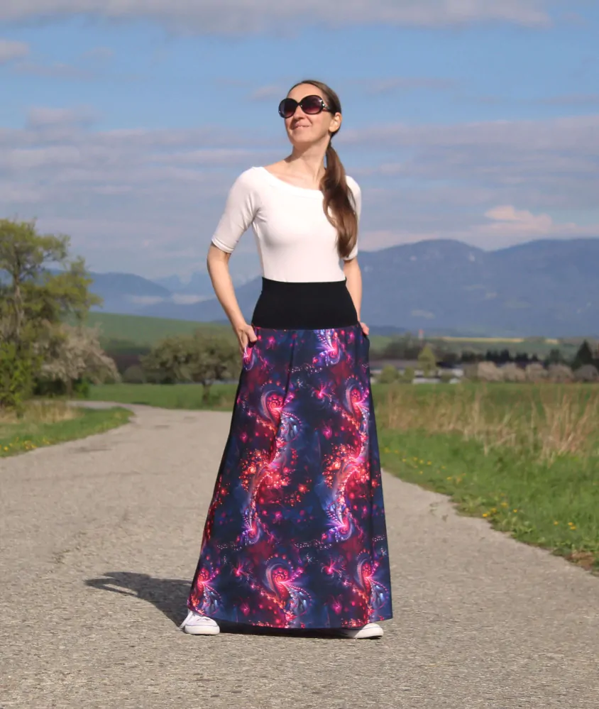 Dlhá elegantná A-čková sukňa je ušitá z príjemného šlachteného polyesterového úpletu (94 % polyester, 6 % elasten). Materiál je veľmi príjemný, je savý, pružný, priedušný, ľahký, nezráža sa. V bočných švíkoch sú vsadené vrecká. V hornej časti je pružný úpletový pás, takže sa pekne prispôsobí postave.